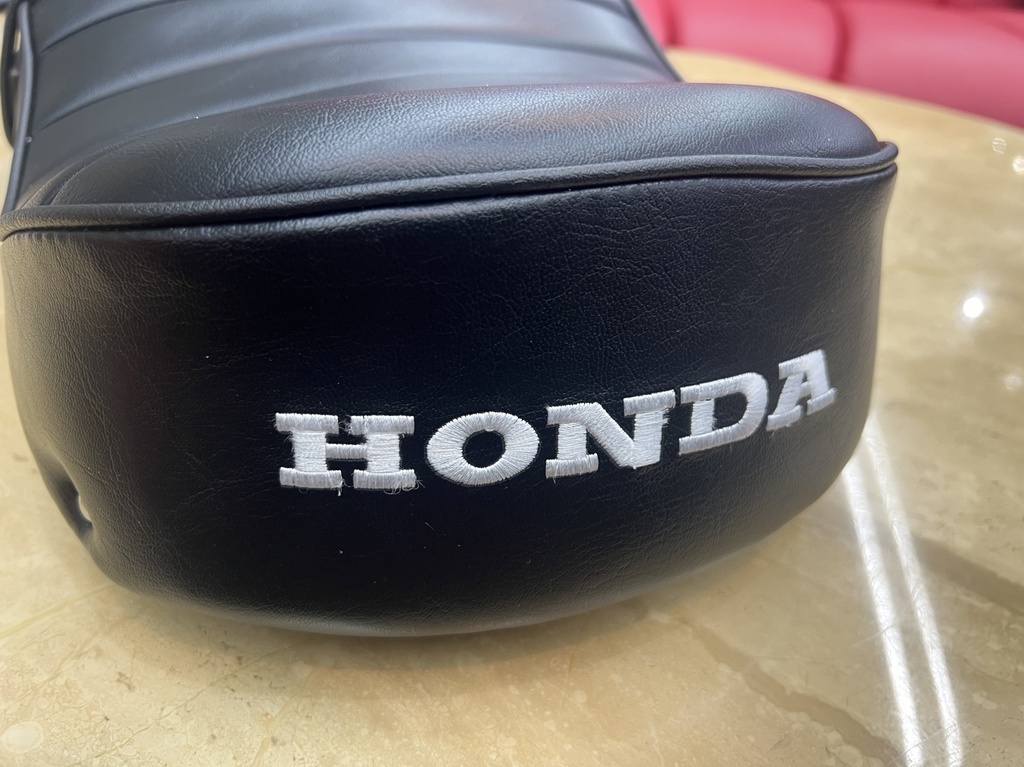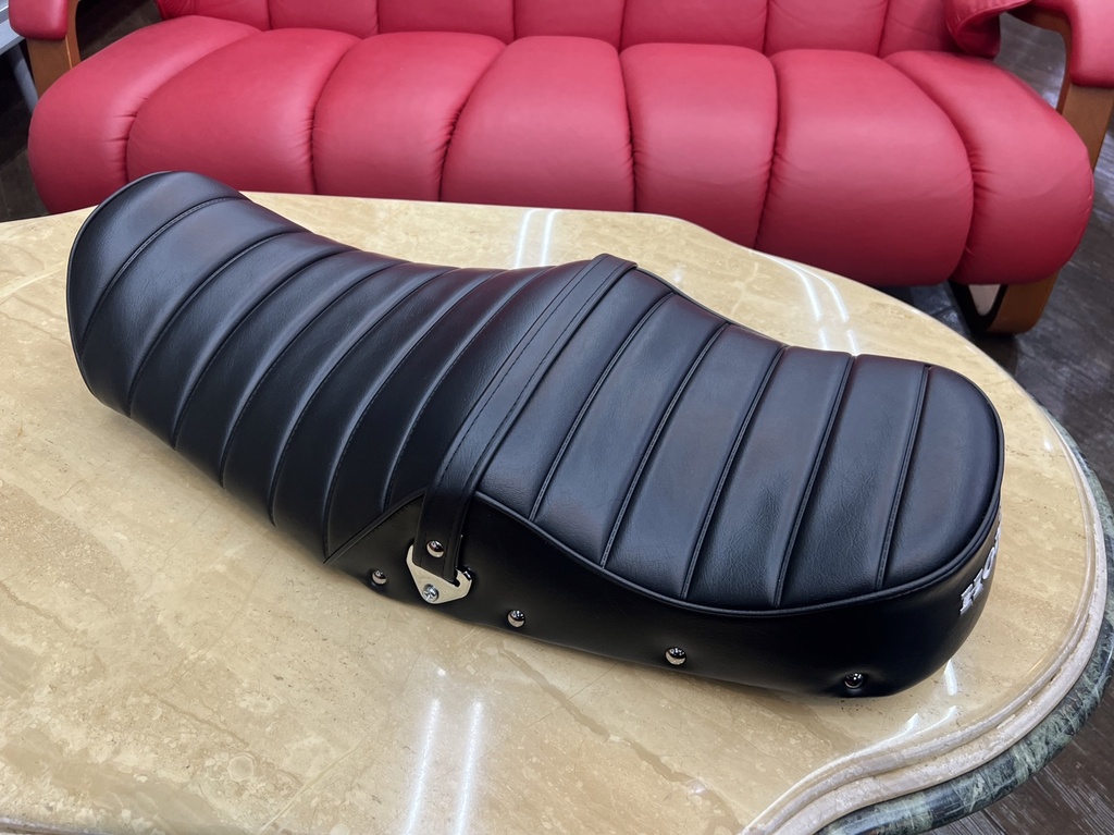 シートはタックロールと刺繍、ベルトとスタッズで旧車っぽい雰囲に!