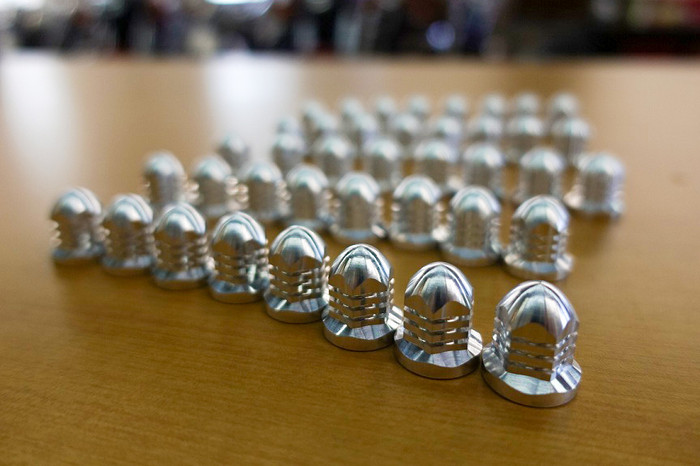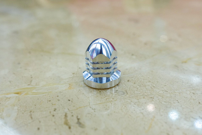 空冷フィンをイメージに取り入れ、アルミを削りだした砲弾型袋ナットです!シルバーアルマイト仕上げ!